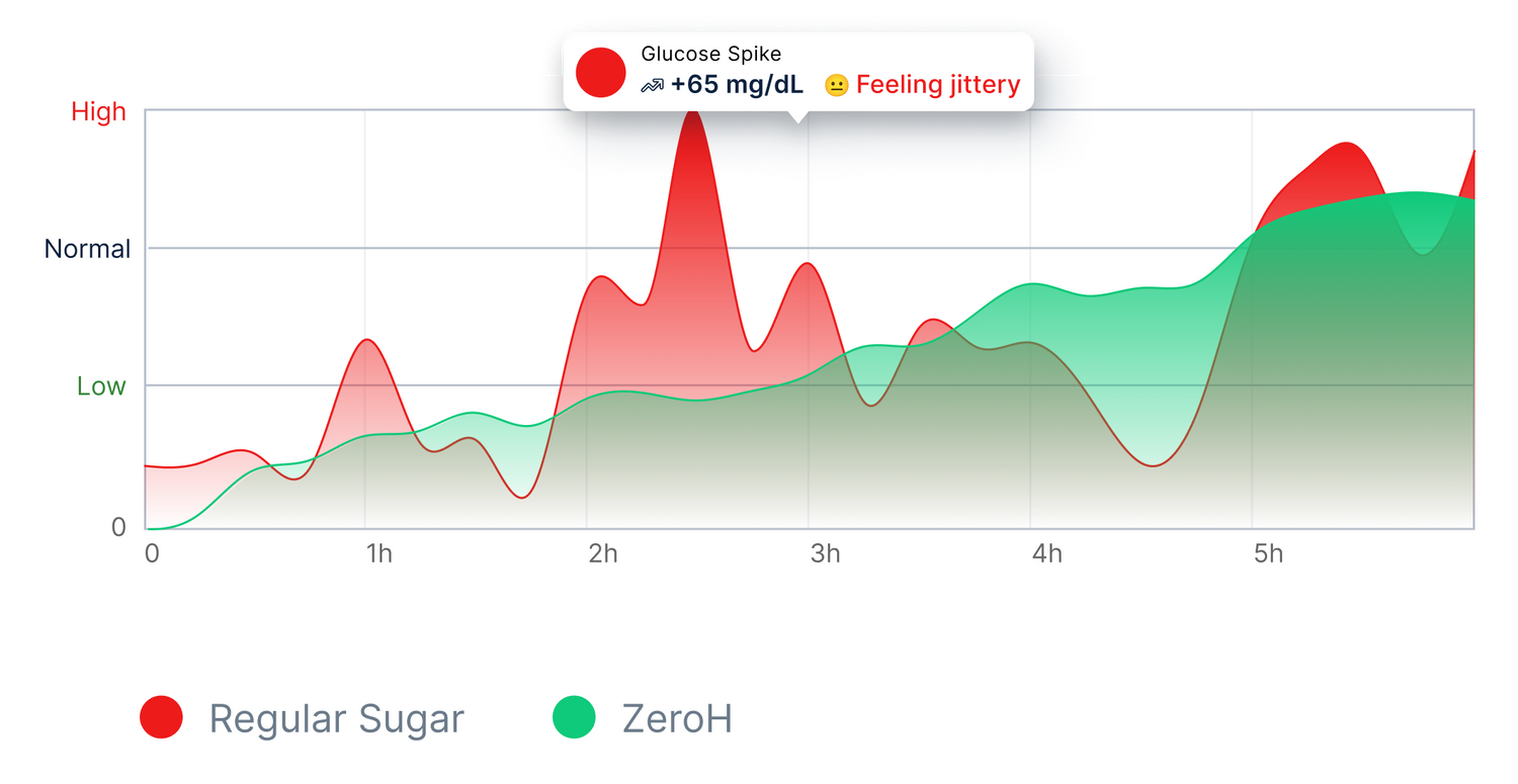 By avoiding the glucose spike, Zeroh prevents the subsequent reactive hypoglycemia (crash) that drives cravings and fatigue.